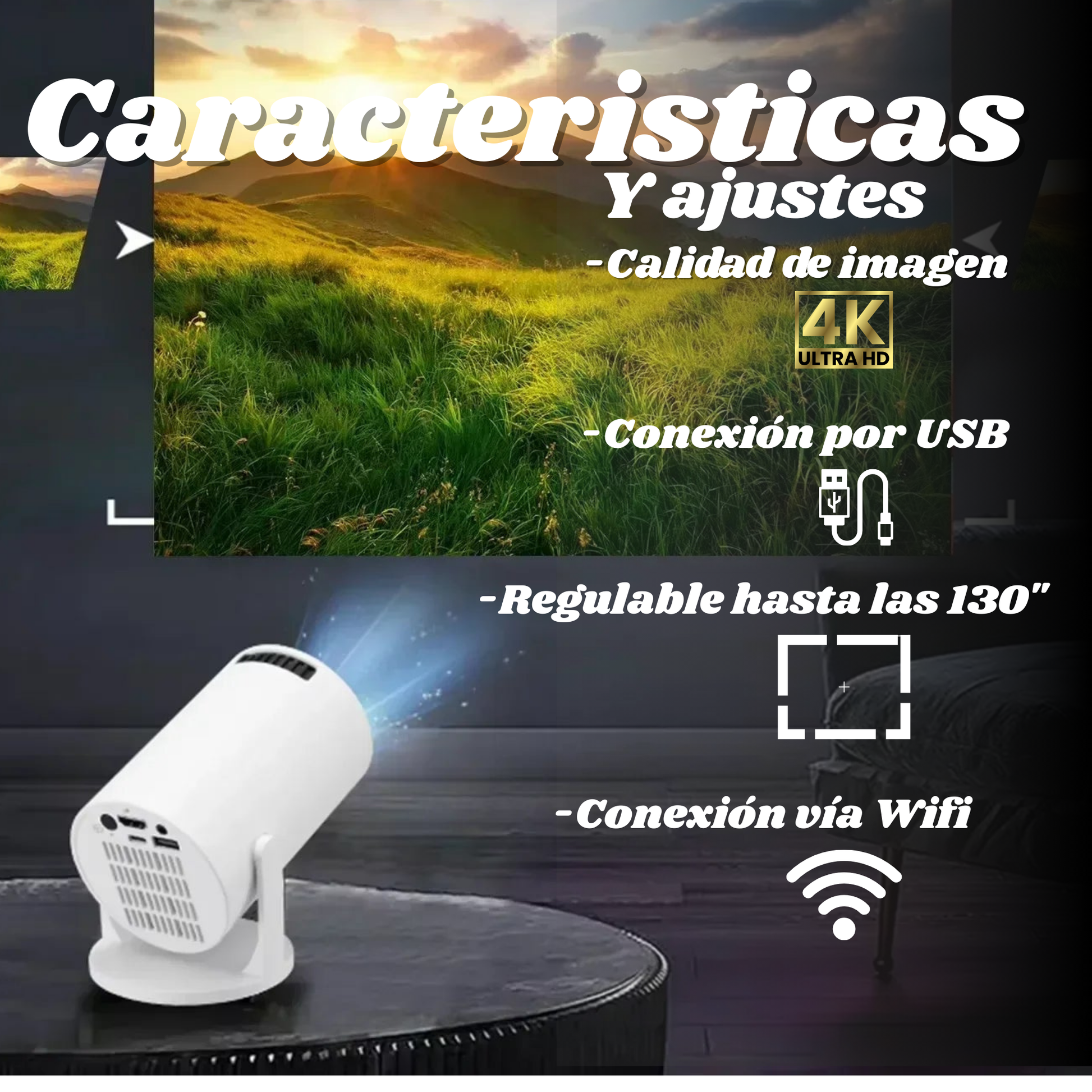 Proyección ajustable hasta 180 pulgadas con calidad nítida 4K.